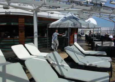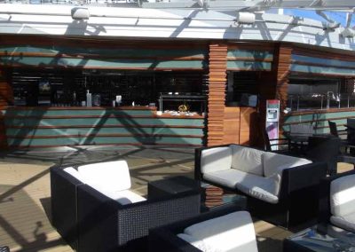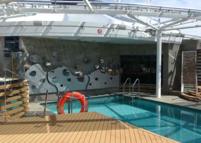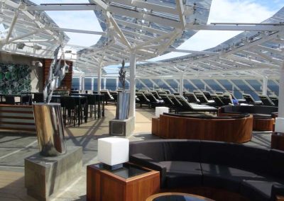 Fast 24 Stunden steht die “Top Sail Lounge” zu Ihrer Verfügung. Diese Panorama-Lounge liegt direkt über der Brücke und garantiert eine spektakuläre Aussicht. Dabei genießen Sie einen Cocktail und bedienen sich bei den feinen Delikatess-Häppchen bei Tag und Nacht und lassen sich von Live-Musik am Abend unterhalten. - Poolbereich „The One“ mit Sonnendeck und Bar