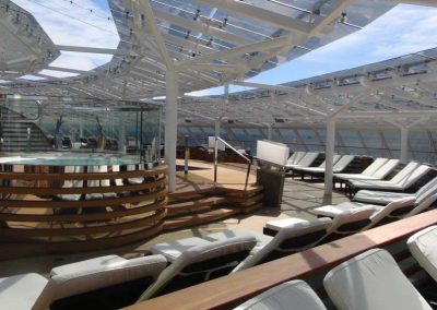 Ganz oben liegt der Außenbereich “One Pool” mit ausreichend Sonnenliegen, Pool und Bar. Darunter die Suiten, die “Top-Sail”-Lounge, der Concierge-Desk und meist das eigene Restaurant. Ein privater Aufzug bringt Sie in den ein Deck tiefer liegenden Spa-Bereich.
