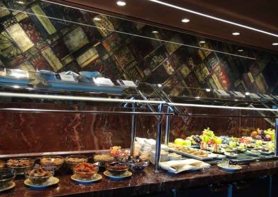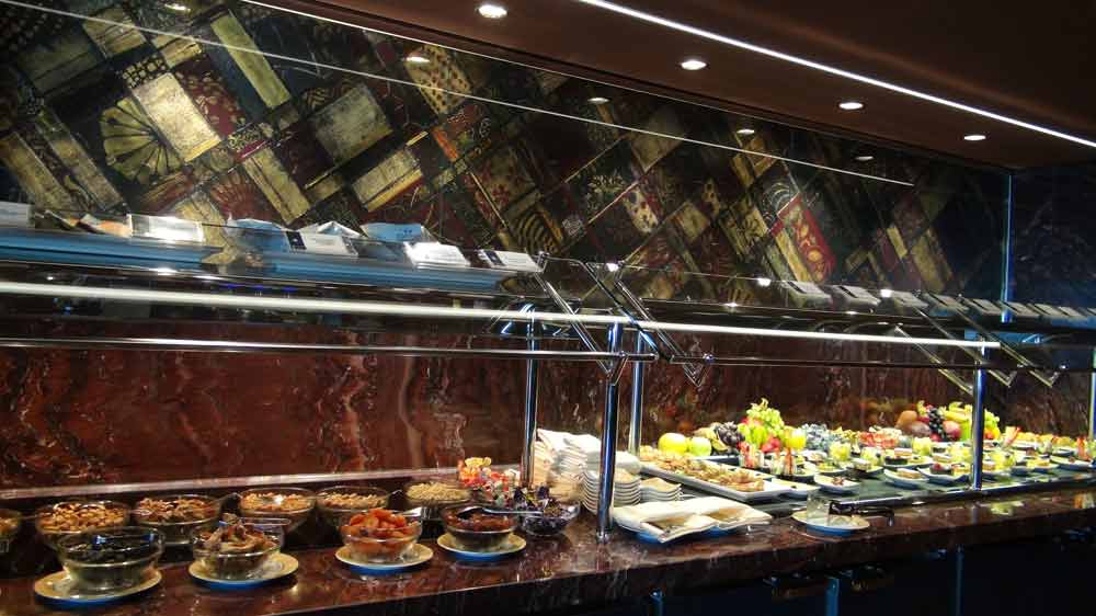 Das Restaurant befindet sich auf diesen Schiffen nicht im Bereich des Yacht-Clubs, sondern Achtern – also im hinteren Bereich des Schiffes. Um zum Restaurant zu kommen muss man also den Yacht-Club verlassen und nach ganz hinten marschieren. Ein Butler begleitet Sie auf Wunsch gerne.