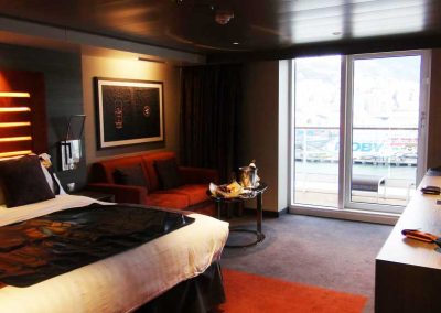 Die Suiten liegen auf den obersten drei Decks im vorderen Teil des Schiffes. Sie haben alle einen privaten Balkon und sind mit mindestens ca. 25m² überdurchschnittlich groß. Auf den neuen Schiffen sind auch Innenkabinen buchbar.